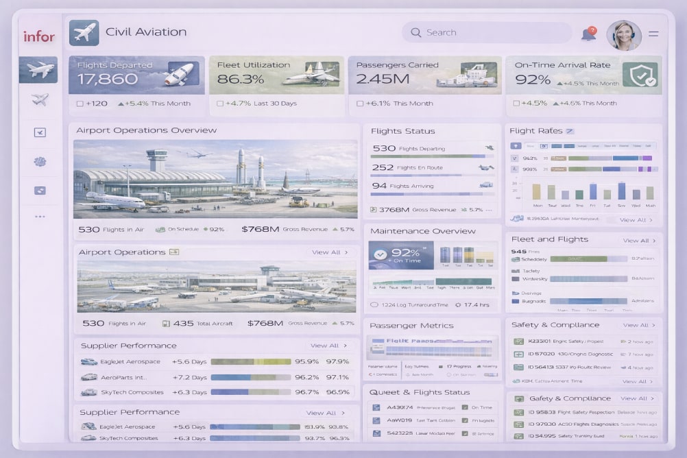 פתרון ERP לארגוני תעופה אזרחית, המסייע לנהל תהליכים תפעוליים והנדסיים לאורך מחזור חיי המוצר — מפיתוח וייצור ועד תחזוקה ותמיכה שוטפת.