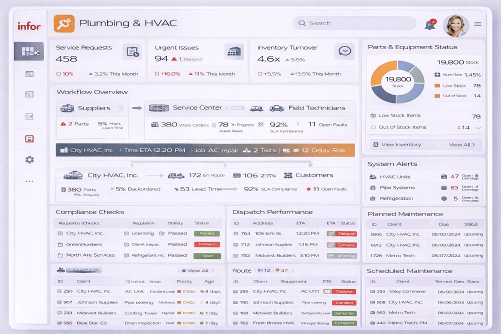 ERP לארגונים בתחום האינסטלציה והמיזוג, עם ניהול מסודר של פריטים, חלפים, מלאי והפצה — בין מחסנים, מתקינים ולקוחות.