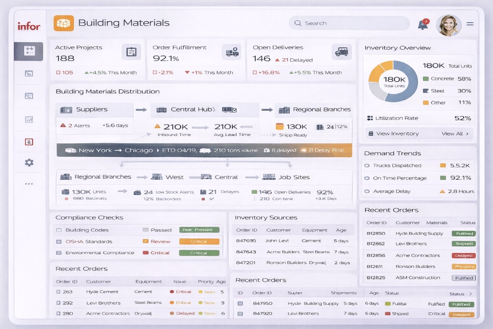 פתרון ERP להפצת חומרי בניין, המסייע לנהל מלאי כבד, תנועות מחסן, הזמנות ואספקה — בסביבה עם עומסים ולוחות זמנים צפופים.
