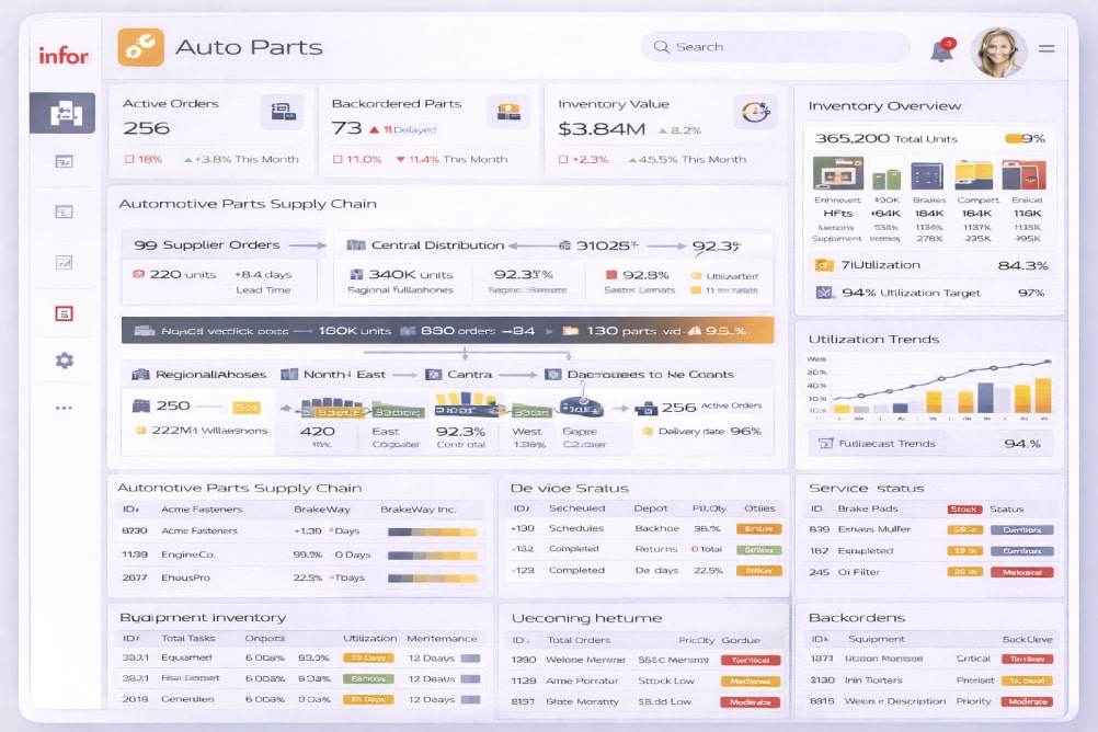 ERP להפצת חלקי רכב, עם ניהול מק״טים רבים, תחליפים, זמינות גבוהה ותיאום בין מחסנים, סניפים ולקוחות.