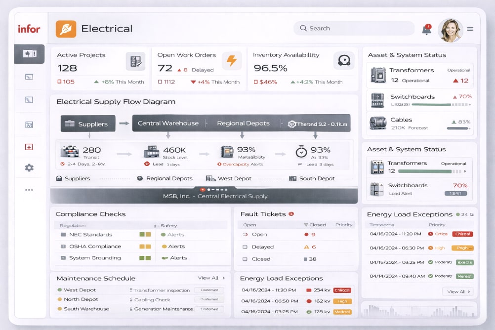 פתרון ERP להפצת ציוד חשמל, המאפשר שליטה במלאי, הזמנות ואספקה — תוך תיאום בין מחסנים, ספקים ולקוחות.