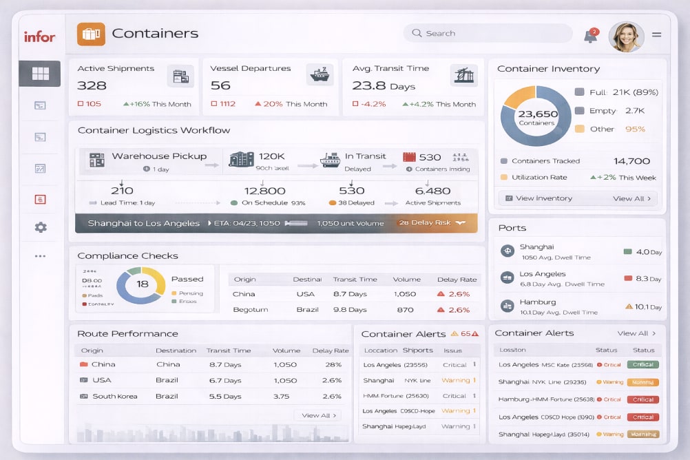 ERP לניהול פעילות מכולות, כולל מעקב אחר מיקום, זמינות, שינוע וחיוב — לאורך מחזור החיים של כל מכולה.